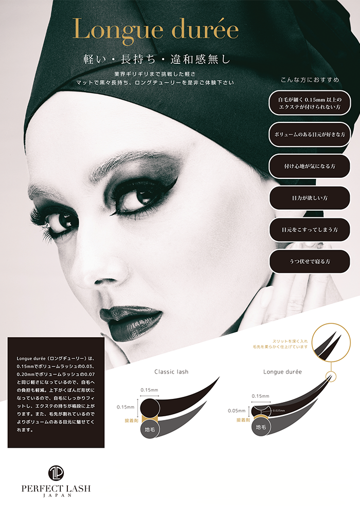極上の柔らかさの専用エクステンションを使用し、シングルラッシュのように毛先までシャープで濃さがあるラインを出し、尚且つしっかりとしたボリュームを感じさせることができる仕上がりとなります。